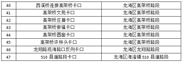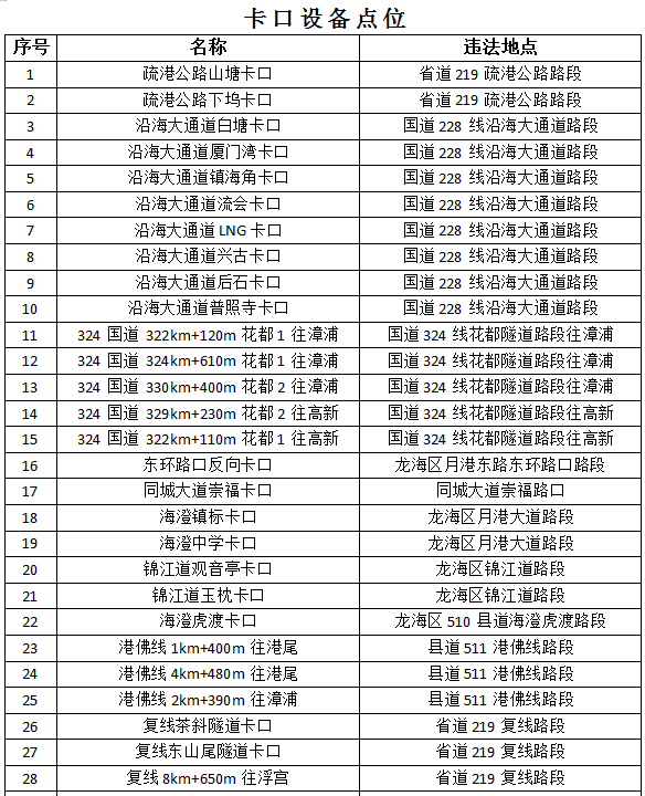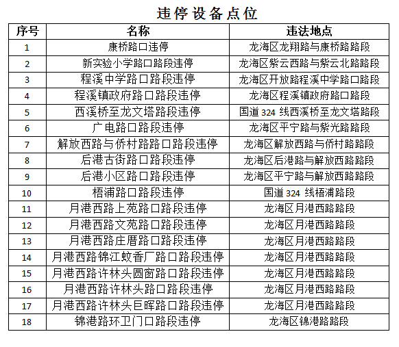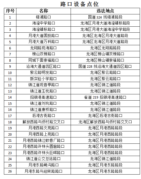 为进一步加强辖区道路交通安全管理,有效预防和减少道路交通事故,创建安全、畅通、有序的道路交通环境,龙海区将新增交通违法采集设备,现将采集设备安装地点、违法行为内容及违法代码进行公示,并将依照《中华人民共和国道路交通安全法》等有关法律法规规定对违法车辆进行抓拍处罚,请广大交通参与者自觉遵守交通法律法规,文明驾驶,共同维护道路交通秩序。