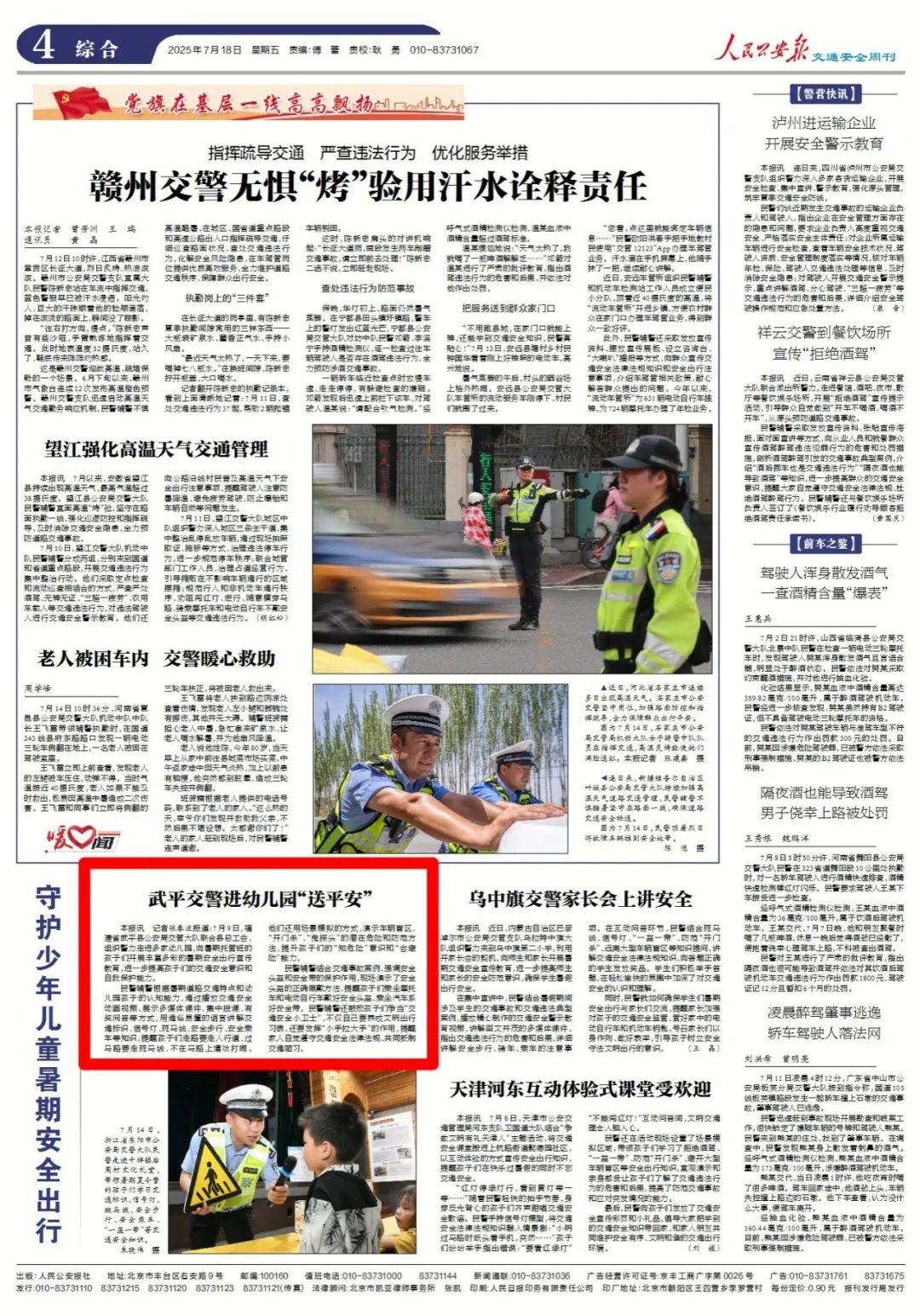 7月18日,《人民公安报》交通安全周刊第04版刊发题为《武平交警进幼儿园“送平安”》,报道武平交警暑期组织警力进暑托班开展交通安全宣传。