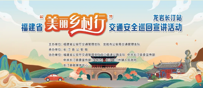 由福建省公安厅交通管理总队、龙岩市公安局交通管理支队主办,长汀县公安局承办,福建省公安厅交通管理总队龙三高速公路支队、中共长汀县委宣传部、中共长汀县委宣传部(文明办)、长汀县汀州镇人民政府协办的福建省“美丽乡村行”交通安全巡回宣讲活动,将在龙岩市长汀县举行。 活动预告 活动时间 7月25日 17:00 活动地点 福建省龙岩市长汀县龙潭公园古戏台