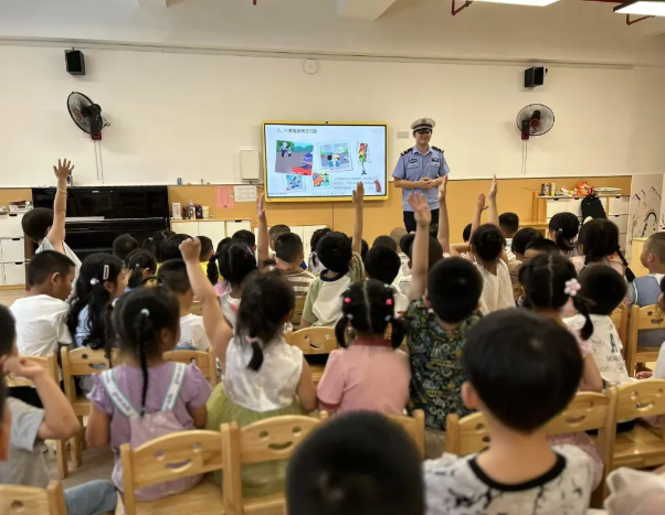 课堂上,宣传人员根据学生暑假出行特点,用通俗易懂的语言结合交通事故案例视频向孩子们普及过马路走人行横道、“红灯停绿灯行”、注意“一停二看三通过”、“一盔一带”等交通安全知识。