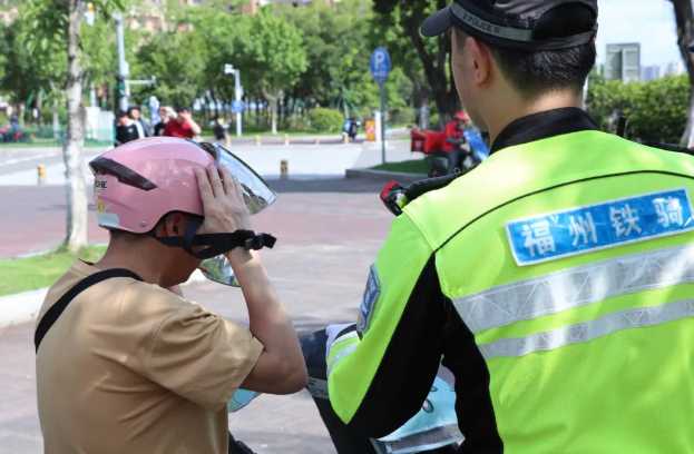 02 细心叮嘱“骑行戴盔” 福州交警耐心劝导骑行者“戴盔系带不闯灯”,同时提醒骑行人员注意防暑,平安出行。