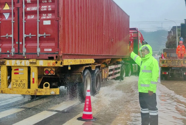 ▲8月1日,受强降雨影响,闽侯县104国道西台村路段出现严重积水。闽侯交警大队迅速启动应急预案,组织警力对积水路段实施临时交通管制。