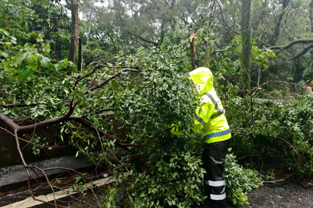▲连续暴雨导致X192县道树木倒伏阻断交通,晋安交警第一时间赶赴现场疏导秩序,并协同鼓岭管委会、公路局开展应急处置,迅速排除险情恢复通行。