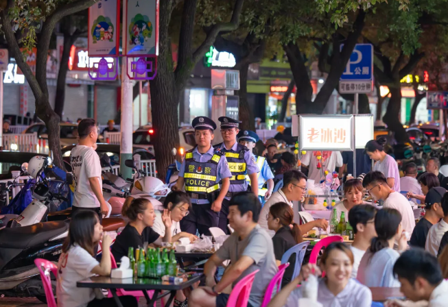 夏日时节,华灯初上,由夜食、夜购、夜演等活动交织而成的“夜经济”画卷,在龙岩市的大街小巷徐徐铺展。红蓝警灯持续闪烁,带来十足的安全感,在这个升腾着烟火气的夏夜里,龙岩公安民警辅警化身“平安守夜人”,在夜色中绘就平安底色,让群众尽享繁华与祥和。