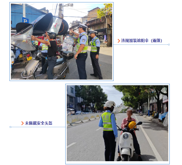 殊不知这些行为 都可能成为交通事故的导火线 为有效遏制电动自行车、二三轮摩托车因违规加装遮阳伞(雨篷)、未佩戴安全头盔等违法行为引发的道路交通事故,连日来,宁德交警持续开展“清伞戴盔”整治行动,切实筑起坚实的安全屏障。