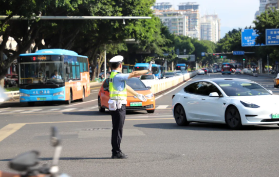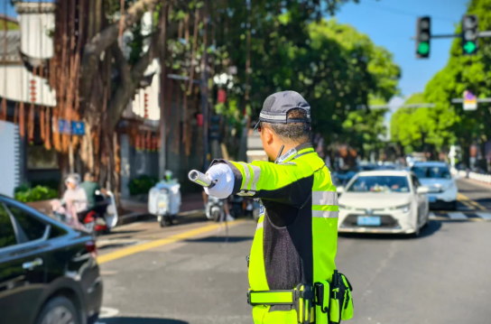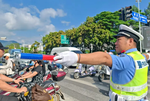 早高峰时段,台江交警在五一路台江路口的烈日“烤”验中开展交通疏导工作。