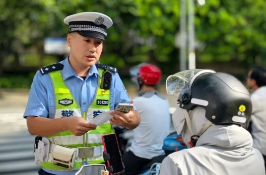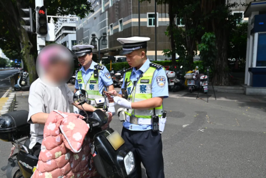 高温炙烤下,鼓楼交警在五四路湖东路口整治交通乱象,开展显见性非机动车违法劝导,叮嘱群众做到规范骑行。