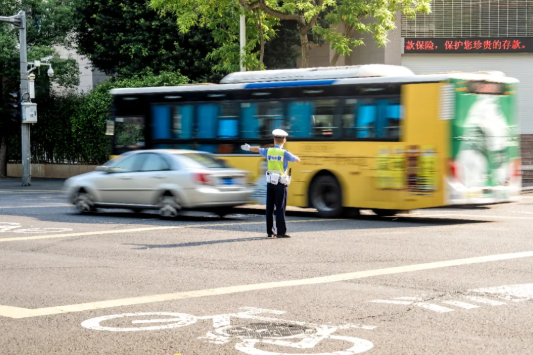 早高峰时段的鼓屏路鼓西路口,鼓楼交警头顶烈日,在热浪中为来往车辆和行人保驾护航。
