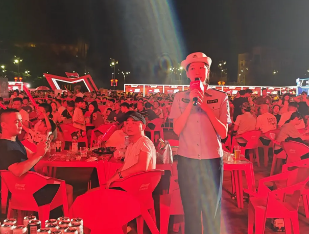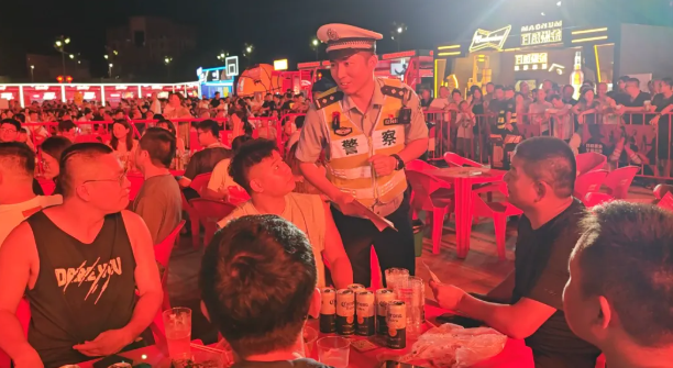 台下,民辅警穿梭在场地间、走进餐桌旁,一边递上宣传单,一边面对面讲解酒驾醉驾的严重后果,贴心提醒大家:娱乐休闲时,千万别忘把出行安全记心间。 |