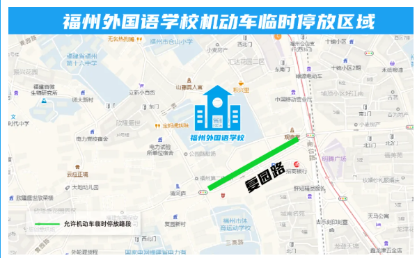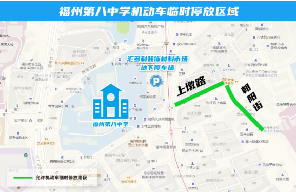 设置机动车临时停放区域 17:00至19:00期间,接送学生的机动车可在朝阳街、上墩路有序临时停放,福州交警将实施人性化管理,不予处罚。