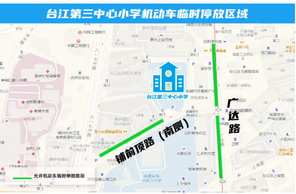 04 台江第三中心小学 设置车辆临时停放区域 上、放学期间,福州交警在铺前顶路南侧(尚都苑斑马线后方)及广达路部分路段设置家长机动车临时停放区域;非机动车临时停放区域设于学校门口两侧。