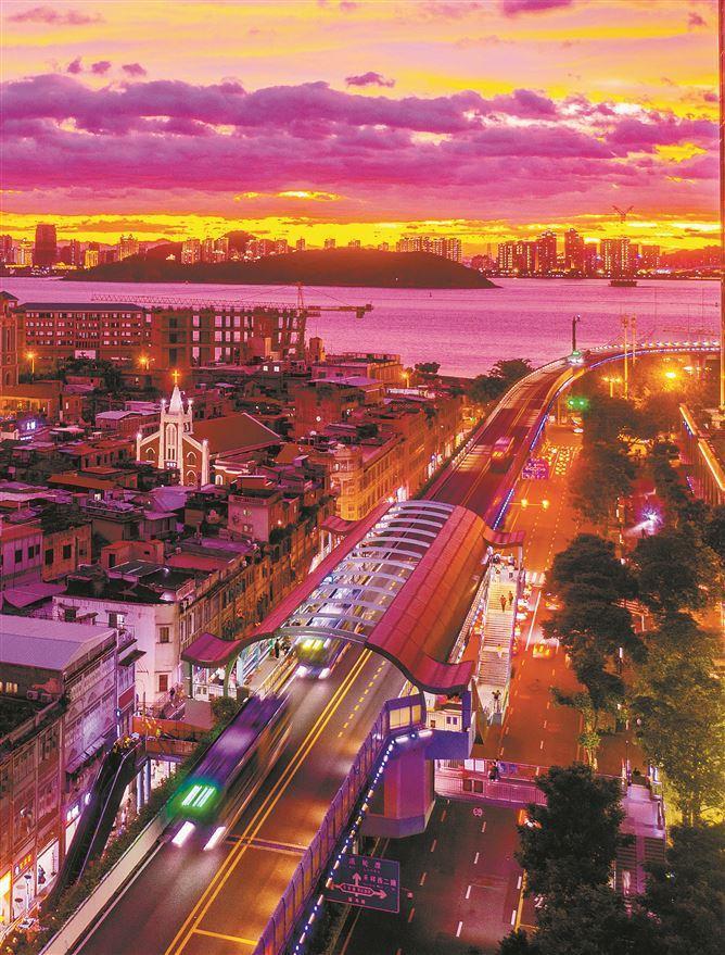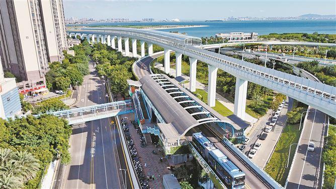 厦门BRT采用高架桥设计,可以让市民游客从高处饱览海滨城市风光。图为BRT开禾路口站。(记者 林铭鸿 摄)
