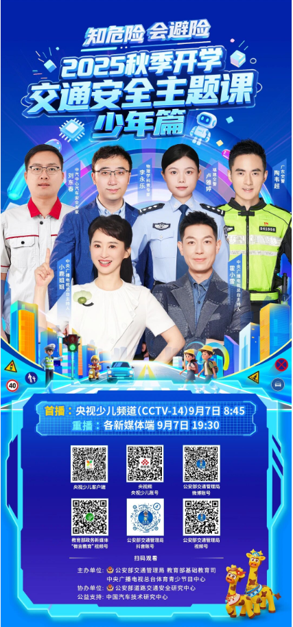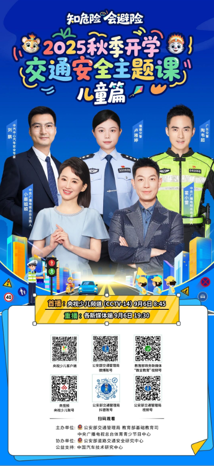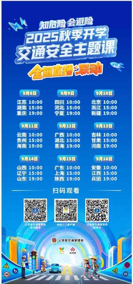 叮铃铃~清脆的铃声响起,新的学年也揭开了崭新一页~公安部交通管理局、教育部基础教育司、中央广播电视总台体育青少节目中心联合录制的“知危险 会避险”2025年秋季开学交通安全主题课如约和大家见面了。图片图片图片 这次的交通安全主题课分龄分开讲—— 儿童篇(9月6日)——给弟弟妹妹: 带你走进动物王国,斑马线为什么像斑马?大象排队有什么秘密?趣味动画+手绘地图,带你轻松玩懂交通安全知识。 少年篇(9月7日)——给哥哥姐姐: 解锁自行车进化史,讲通汽车安全带科学原理,让中学生真正做到独立出行有底气。 两场班会看不够?放心吧,全国各地交警也结合开学季,开展了形式多样的交通安全主题活动,把交通安全知识送进校园、送进课堂。各地交警新媒体账号也将联合央视少儿、央视频平台,连续9天、每天3场进行接力直播! 收看指南 儿童篇:9月6日 08:45 央视少儿频道(首播) 19:30 各新媒体平台(重播)