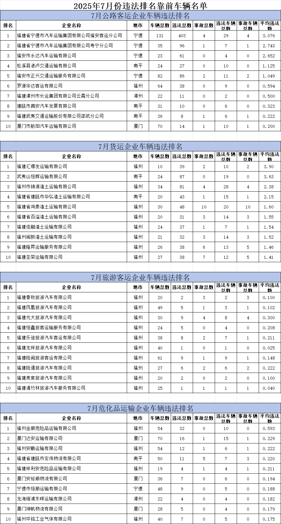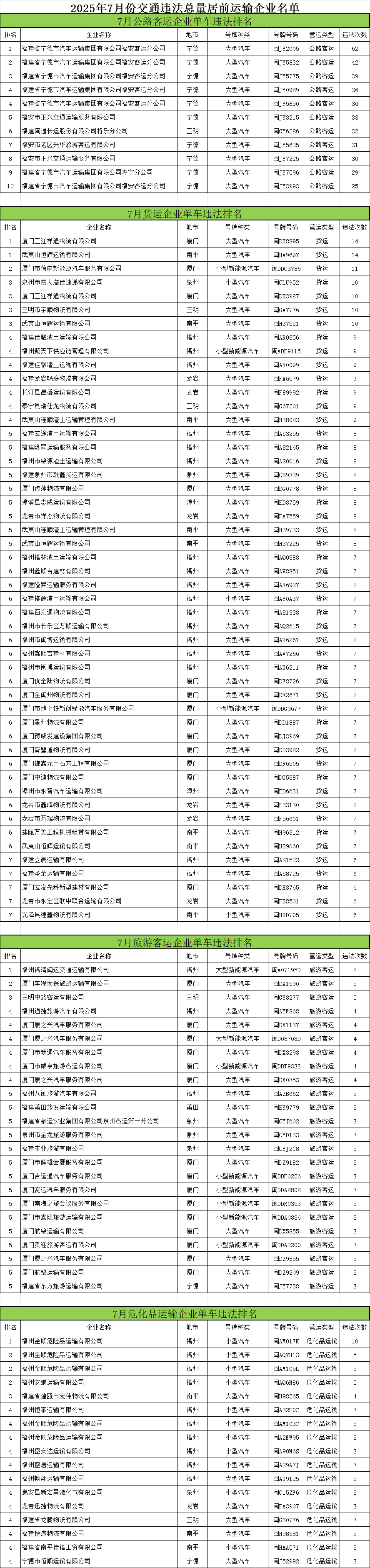 东南网9月10日讯(本网记者 翁莉 通讯员 陈浩)日前,省公安厅交通管理总队曝光7月份交通违法总量居前的公路客运、普通货运、旅游客运、危险货物运输四类企业及车辆名单,旨在警示并督促相关企业及驾驶人加强道路交通安全隐患排查治理,切实预防和减少道路交通事故。 交警部门提醒,道路运输企业应严格落实交通安全主体责任,强化车辆动态监控管理,通过实时提醒督促驾驶员依法依规安全行车。驾驶员应严格遵守道路交通安全法律法规,注意观察交通标志标线,规范驾驶行为,密切关注气象、交通等部门发布的预警信息和路况提示,提前做好应对。特别要杜绝超速、超载、违规超车会车、疲劳驾驶等易肇事致祸的违法行为,共同维护安全有序的道路交通环境。