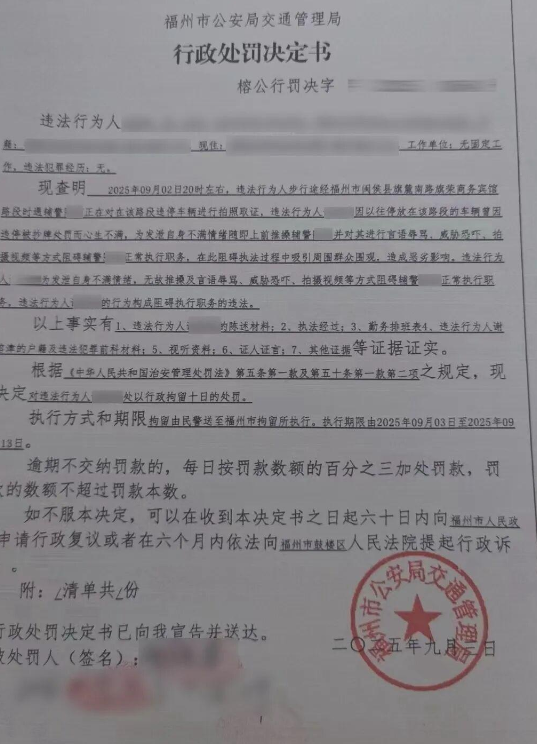 近日,高新交警铁骑在旗麓南路依法对违停车辆进行拍照取证,途经此处的谢某津因曾违停在该路段被抄牌处罚而存不满,便上前推搡铁骑,并以辱骂、威胁恐吓、拍摄视频等方式阻碍正常执行勤务,造成恶劣影响。 高新交警大队接到消息后迅速调集警力赶赴现场,将谢某津控制并固定证据,随后移交执法部门依法处理。 次日,福州市公安局交通管理局依法对阻碍执行职务违法人员谢某津处以行政拘留10日的处罚。