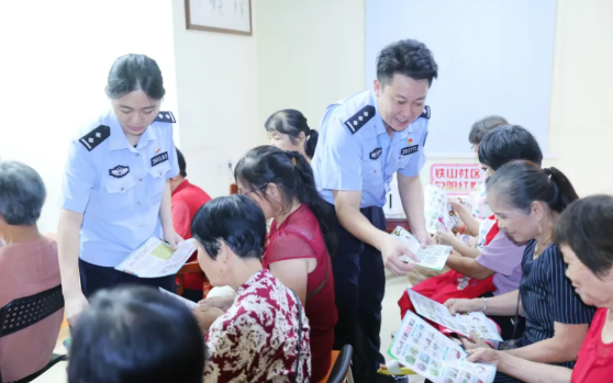 7月21日,在灌口镇铁山社区居家养老服务站,灌口交警中队指导员翁博超结合身边事故案例,用闽南语给老人们讲解出行安全知识。