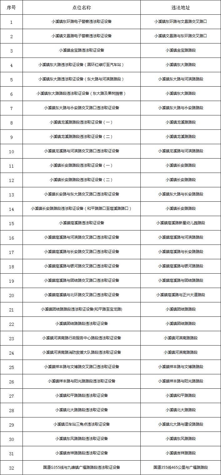 关于平和县辖区新增交通违法采集设备的通告 为进一步规范道路交通秩序,提升交通安全管理水平与交通文明程度,为广大群众出行创造安全、畅通的交通环境,平和县公安局交通管理大队拟在辖区内新增32个交通违法采集设备。根据《中华人民共和国道路交通安全法》等有关法律法规规定,现将设备安装地点、抓拍的交通违法行为进行公示,并将在公示之日起7日后,依法对交通违法行为进行抓拍处罚,望广大群众相互转告,自觉遵守交通法律法规,安全文明出行,共同维护道路交通秩序。 设备具体安装地点、违法行为内容及违法代码公示如下。 平和县公安局交通管理大队 2025年9月12日 设备点位