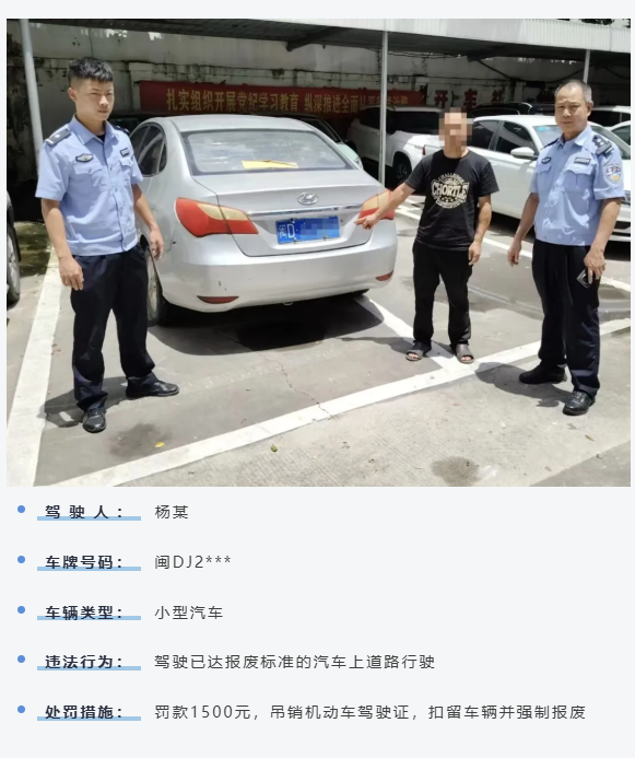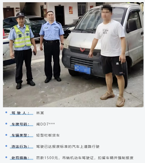 根据国家机动车强制报废标准 逾期未报废车辆 禁止上路行驶 然而不少车主仍心存侥幸 殊不知这看似“省钱”的行为 不仅存在极大的安全隐患 而且也是严重的交通违法行为 厦门交警持续严查严处! 案例一