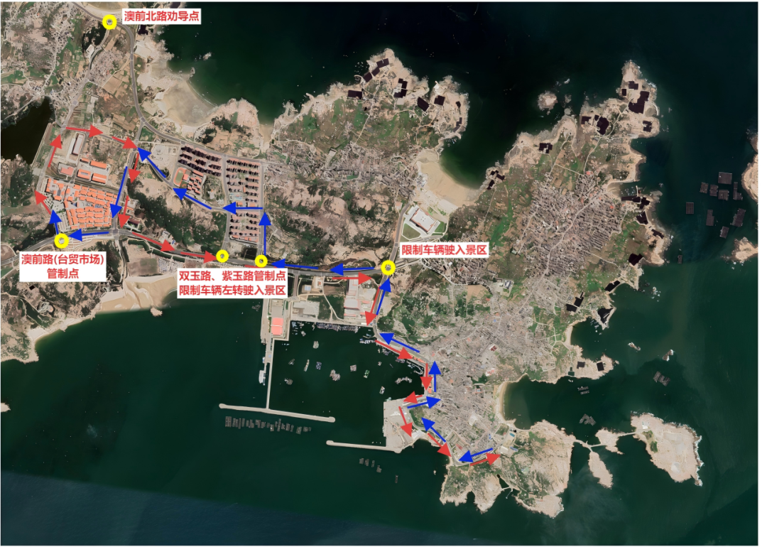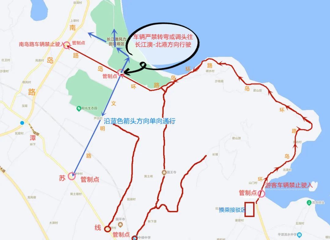 为进一步助力平潭国际旅游岛建设,保障“十一”假期来岚游客和广大市民朋友安全、有序、舒心旅游,依据《中华人民共和国道路交通安全法》及相关实施条例有关规定,决定自2025年10月1日起至2025年10月8日止,采取临时交通管理和保障措施,具体措施如下: 一、环岛路“北港-长江澳”景区 (一)管制时间 每日7:30-19:30 (二)管制范围(详见管制示意图) 环岛路“山门前”路口-环岛路“南岛路”路口,162县道文明路口、大坪村部路口、中楼卫生院北侧路口。 (三)管制措施 1.环岛路“山门前”路口 (1)对游客车辆实行换乘接驳服务,禁止车辆驶入,统一引导车辆至附近的停车区域停放,乘坐接驳车进入景区; (2)对景区内已核发通行证居民车辆实行单向通行管制,允许车辆从“山门前”路口驶入,南往北单向通行,禁止在管制路段中间掉头由北往南反向通行。 (3)沿线车辆缓行时,将对二轮车进行动态管控,引导二轮车停放至换乘区,游客乘坐接驳车进入景区。 (4)进入景区的车辆需停放至停车场或民宿,禁止停放至沿线道路。 2.北港--长江澳沿线村路口 北港--长江澳沿线村居内车辆禁止转弯后由北向南往“山门前”方向通行,统一向北经文明路或南岛路行驶。 3.文明路“芦洋加油站”路口--“环岛路”路口 该路段实行单向通行管制,禁止车辆从该路口前往长江澳;不限制管制路段内居民车辆通行。 4.环岛路与南岛路交叉路口 该路段实行单向通行管制,禁止车辆从该路口前往长江澳。 5.162县道中楼卫生院北侧路口、大坪村部北侧路口 该路段实行单向通行管制,禁止车辆从该路口前往长江澳。