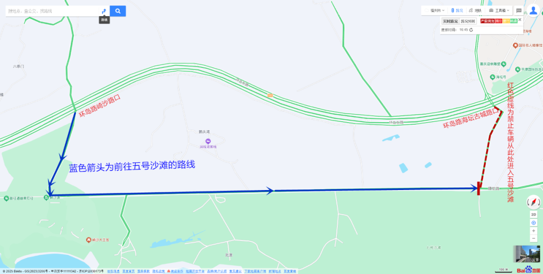 四、五号沙滩 (一)管制时间 每日8:00—20:00 (二)管制范围(详见示意图) 西至环岛路磹前路口至崎沙路口路段,北至磹前路,南至环岛路崎沙路口往东路段,东至战备路的区域(详见示意图) (三)管制措施 前往“五号沙滩”的车辆,统一从环岛路崎沙路口进入战备路,战备路实行由南往北单向通行,由环岛路磹前路口(环岛路海坛古城路口)驶出;禁止游客车辆从环岛路磹前路口前往五号沙滩。