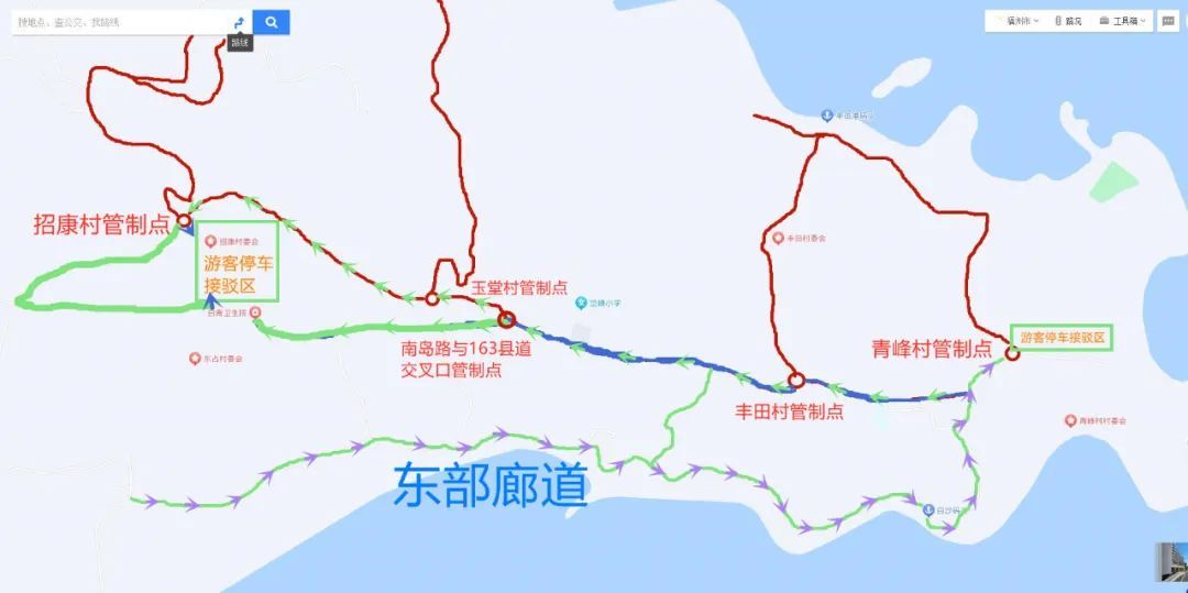 备注:北港--长江澳沿线村民、民宿和餐饮经营者车辆凭通行证由“山门前”驶入景区。游客凭线上住宿订单由“山门前”前往沿线民宿。 二、北部廊道景区 (一)管制时间 每日09:00—19:30 (二)管制范围(详见管制示意图) 在南岛路招康村口、玉堂村口、南岛路与163县道交叉口,163县道丰田村口、青峰村口等设置交通管制点。 (三)管制措施(游客车辆按照示意图箭头通行) 1.南岛路招康村口管制点 对游客车辆实行换乘截流管制,限制游客车辆驶入,游客车辆统一引导至招康村停车场、换乘接驳车进入景区。 2.南岛路玉堂村疏导点 前往玉堂村及南盘村的游客车辆,持相关的民宿和餐饮订单从该路口进入景区。 3.163县道丰田村管制点 该路口为景区出口,禁止游客车辆从该路口驶入景区。 4.163县道青峰村口管制点 对游客车辆实行换乘接驳服务,限制游客车辆驶入,游客车辆统一引导至青峰村停车区域,换乘接驳车进入景区。
