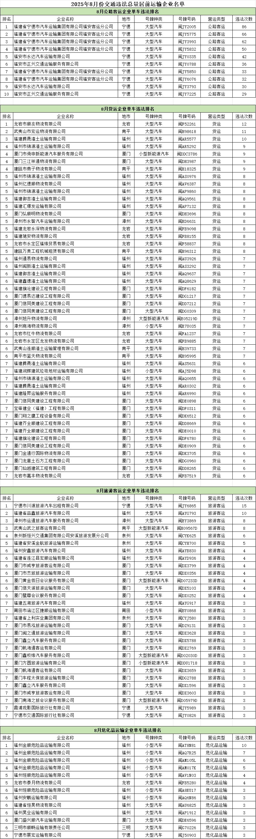 东南网9月28日讯(本网记者 翁莉 通讯员 陈浩)日前,省公安厅交通管理总队曝光8月份交通违法总量居前的公路客运、普通货运、旅游客运、危险货物运输四类企业及车辆名单,旨在警示并督促相关企业、驾驶人加强道路交通安全隐患排查治理,有效预防和减少道路交通事故。 交警部门提醒:道路运输企业须落实交通安全主体责任,强化车辆动态监控,实时提醒驾驶人安全行车;驾驶人应遵守交规、留意交通标志,关注预警与路况,杜绝超速、超载等违法行为,同时珍爱生命、拒绝酒驾。针对大货车,无论步行、骑车还是驾车,均需保持安全距离,不尾随、不抢道抢灯,不长期在其右侧行驶及右侧超车,谨防“死亡弯月”风险。此外,驾驶人在高速行车时需保持安全车距,严禁占用应急车道;若发生交通事故或车辆故障,务必谨记“车靠边,快警示,人撤离,即报警”的处置原则。