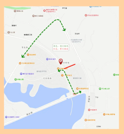关于山亭镇碧桂园周边部分道路实行限制交通的通告 为保障国庆长假期间游客临时泊车点的有序运行,确保通岛道路畅通,根据《中华人民共和国道路交通安全法》第三十九条规定,决定对临时泊车点所在的山亭镇碧桂园周边部分道路实行临时交通管制,现将有关事项通告如下: 一、管制时间:10月1日—10月8日。 二、管制路段:天后东路与宋港路交叉路口。 三、管制措施:管制期间,该路口禁止车辆通行,需行经该路段车辆可通过以下路段提前绕行: ①天后东路南侧临时通道↔海丝路↔忠湄街 ②贤良路↔新文路。