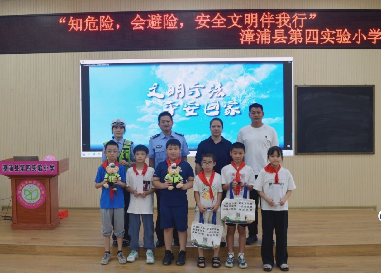 ▲漳浦交警大队副大队长林武城带队走进第四实验小学,讲解安全过马路、安全乘车等知识,通过趣味问答与学生们积极互动。