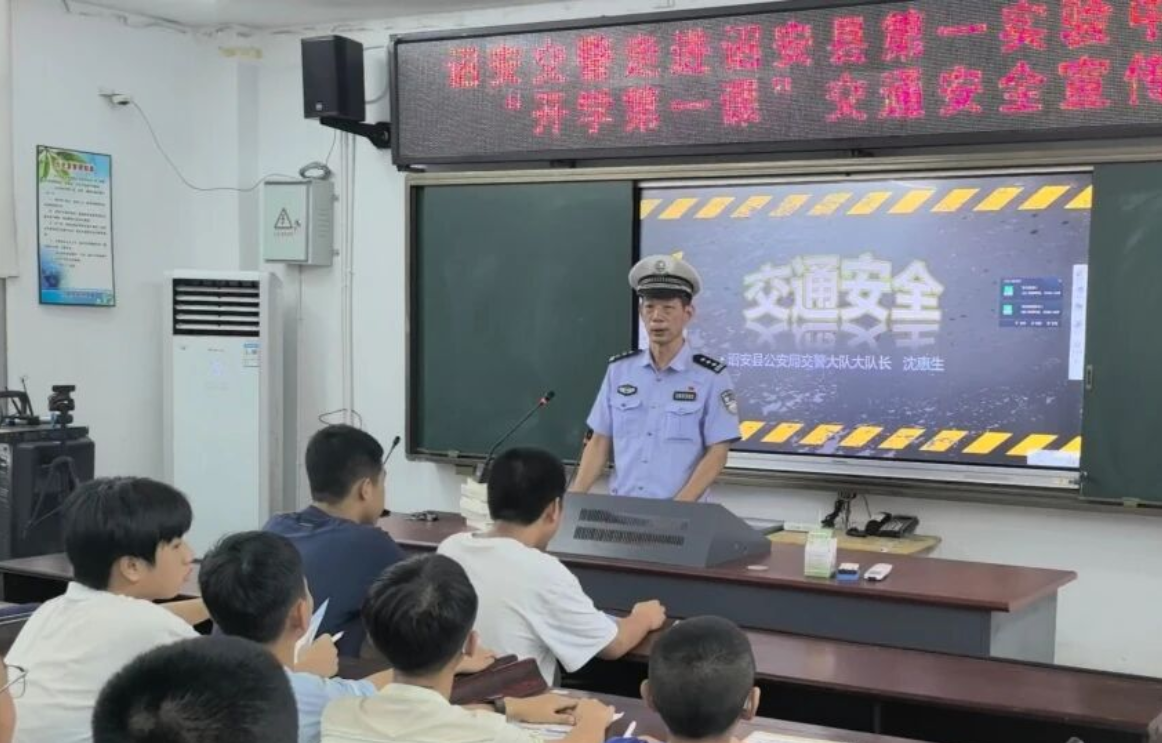 ▲诏安交警大队大队长沈惠生带队走进第一实验中学,带来了交通安全“开学第一课”,并深入学校周边查看调研交通环境。