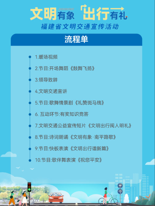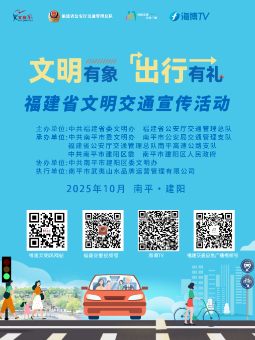为深入学习贯彻习近平总书记关于精神文明建设工作的重要批示精神,落实“明礼福建人”公共文明素养提升行动的部署要求,10月10日19:30,由省委文明办、省公安厅交通管理总队主办,南平市委文明办、南平市公安局交通管理支队以及建阳区委、区政府等多部门承办的“文明有象•出行有礼”主题宣传活动,在南平市建阳区考亭书院广场举行。届时将会在“福建文明风”网站、“@福建交警微发布"视频号、“@海博TV”、“@FM100.7福建交通应急广播”等平台全程实时直播,欢迎广大网友观看。