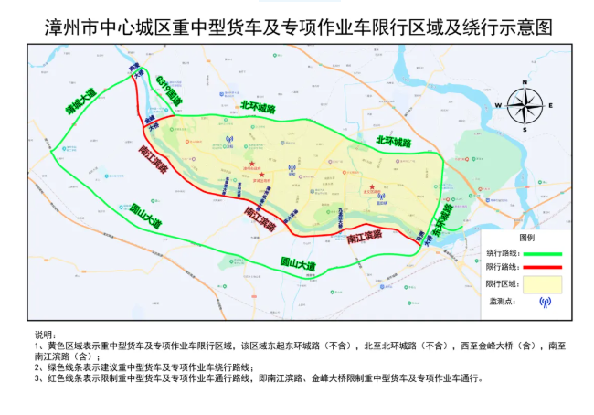 大货车经过漳州主城区禁限行区域如何通行 一、漳州主城区 货车禁限行规定 (一)限行区域:东起东环城路(不含),北至北环城路(不含),西至金峰大桥路口(含),南起南江滨路(含)。 (二)限行时间:全天24小时禁行。 (三)限行车型:重中型货车及专项作业车 (四)其他车型:中型厢式货车(长≤6米、宽≤2.2米、高≤2.8米)及新能源中型厢式货车不限行。 (五)通行的车辆途经桥梁等道路时,要严格按照设置的限制质量、限制轴重标志要求通行。 禁限行区域已在导航软件上标注。 二、分流绕行路线 过境重中型货车可经马洲大桥、东环城路、北环城路、迎宾西路、南陵大桥、靖城大道、圆山大道绕行,或经G1523甬莞高速、G76厦蓉高速绕行。 三、相关要求 (一)限行管制区域外围道路将设置交通诱导标志,引导分流过境重中型货车,请驾驶员按照交通标志指示通行。 (二)管制区内的货物进出,建议通过轻型、微型货车转运,因重点工程建设、涉及民生的物流等特殊需要需进入限行管制区域的重中型货车可通过交管“12123”APP平台、“闽政通”、“漳州通”等网上渠道办理货车电子通行码或线下向芗城、龙文、高新交警大队申请办理《特殊车辆通行证》,按指定时间、路线通行。 (三)在申领货车通行码过程中遇到问题可联系相关交警大队,要求答疑解惑或及时审核,以下为相关联系方式: 1、途经芗城辖区申领货车通行码,可联系芗城交警大队:0596-2089702; 2、途经龙文辖区申领货车通行码,可联系龙文交警大队:0596-2638988; 3、途经南江滨路申领货车通行码,可联系高新区交警大队:0596-6665122。 示意图