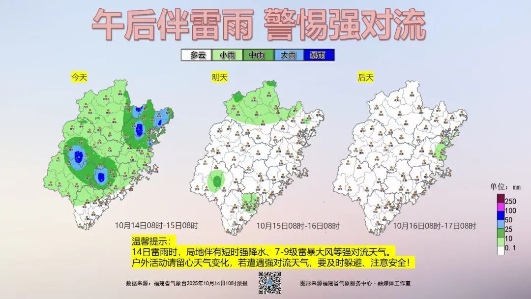 降雨方面 今天(14日),全省阴到多云 大部有阵雨或雷阵雨,部分中雨到大雨 局部暴雨到大暴雨 雷雨时局地伴有短时强降水 7-9级雷暴大风等强对流天气 15日,全省多云 内陆地区有分散性阵雨或雷阵雨 局部大雨 其余地区局部有阵雨或雷阵雨 16日,全省多云 热雷雨转移到沿海地区 有分散性阵雨或雷阵雨 其余地区局部有阵雨或雷阵雨