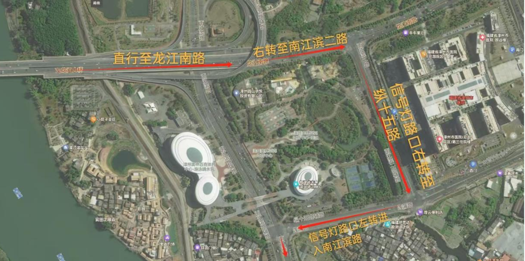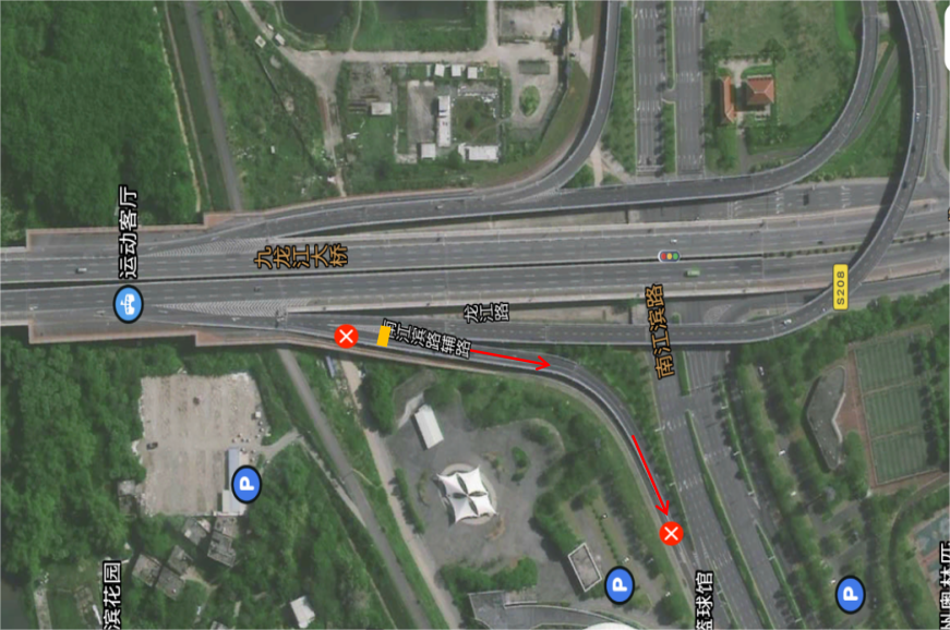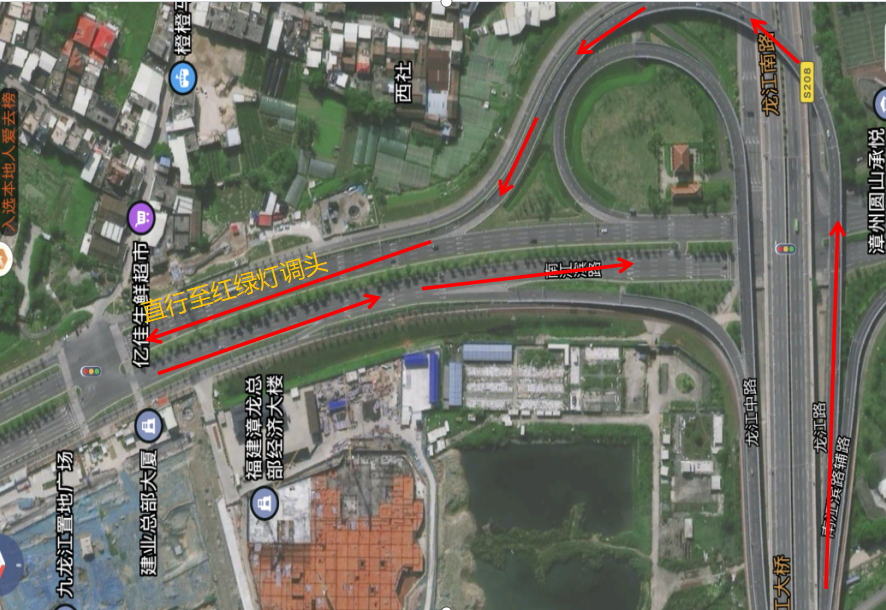 (二)车辆可由上行匝道进入南江滨至红绿灯处掉头。具体行车路线如下图所示: