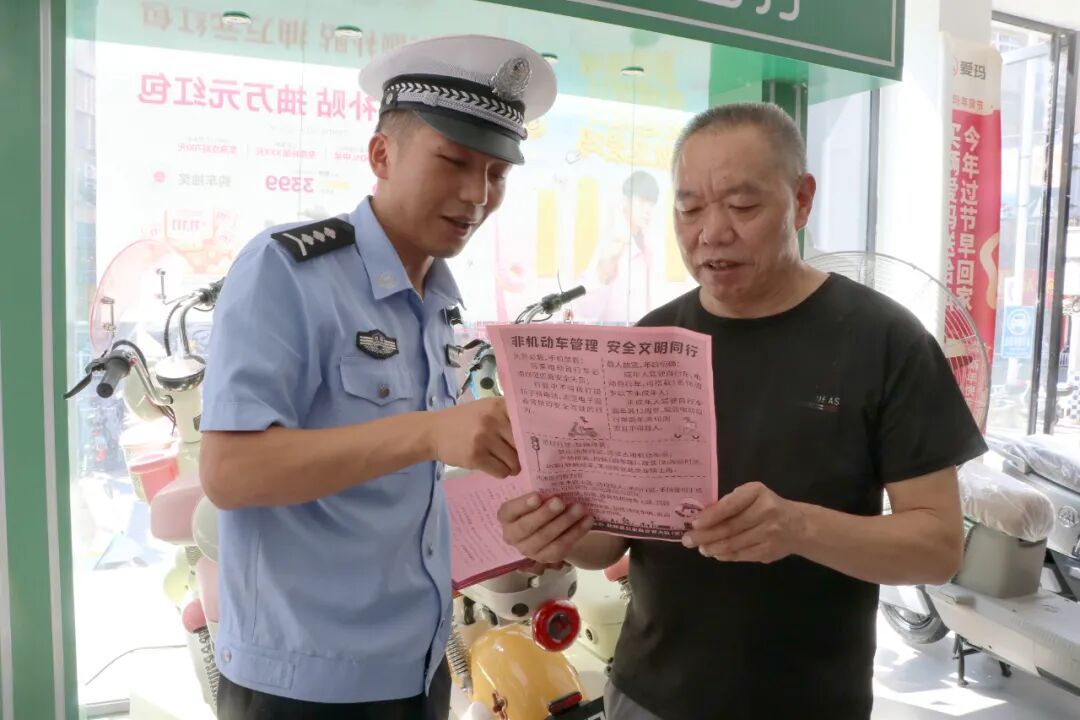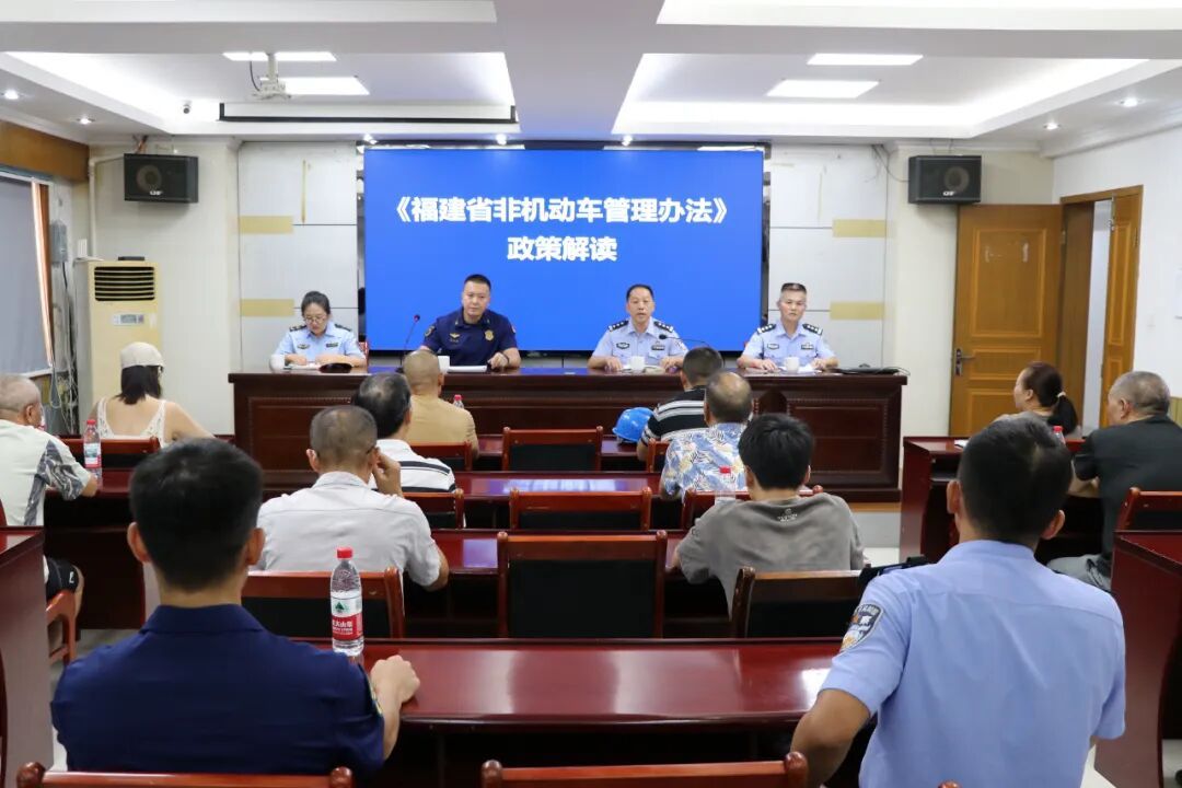 10月15日,政和公安交警联合政和县消防救援大队、市场监督管理局,为电动车销售企业、快递外卖及共享单车行业负责人,以及教育局领导,政和一中、二中、三中的分管安全副校长,开展“南盾5号”专项行动新修订《福建省非机动车管理办法》政策解读宣讲。三家单位从交通安全管理、销售规范、消防安全三个维度,详细讲解了《福建省非机动车管理办法》修订的重点内容以及注意事项。会后,三家单位还深入辖区电动自行车销售企业开展安全走访,从源头上排查安全隐患。向商户重申法规要求,宣讲《福建省非机动车管理办法》,强调销售企业需切实履行交通安全宣传的“第一责任人”职责。 宣传进村入户 提升安全防范意识