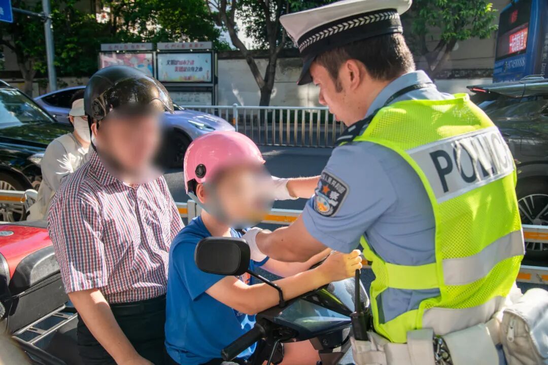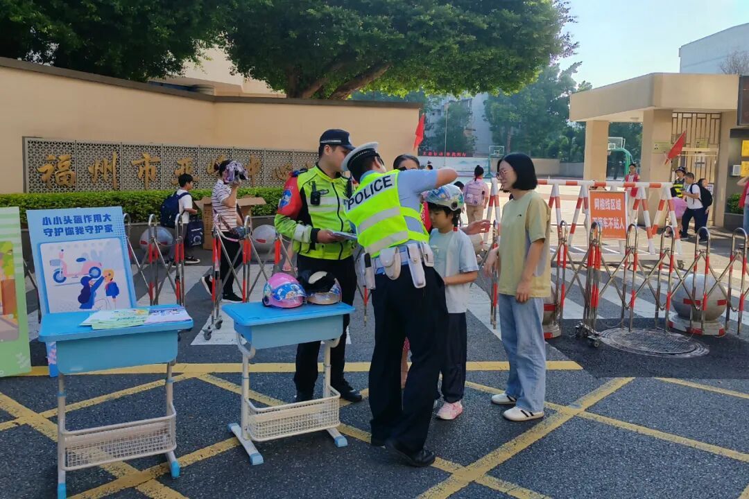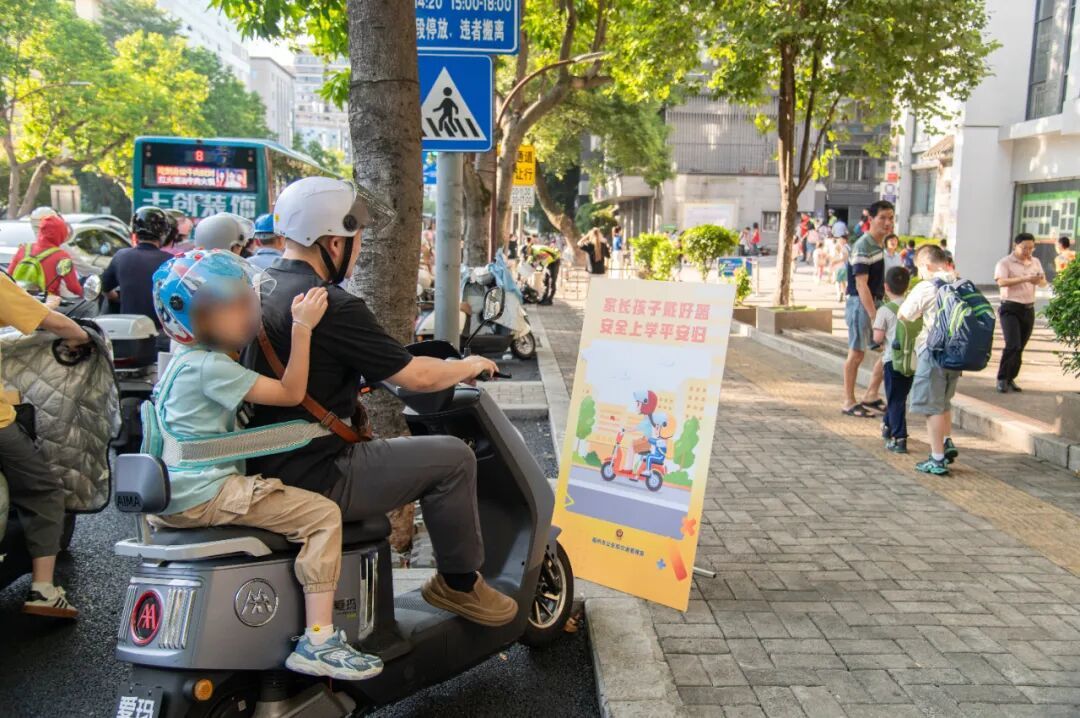 头等大事 共同践行 福州交警郑重提醒广大家长 骑电动自行车接送孩子 大人小孩都请戴好安全头盔 为守护学生出行安全,筑牢家校往返途中的安全屏障,福州交警通过多种形式,在校园周边广泛开展头盔佩戴专项宣传,倡导家长与学生们养成正确佩戴习惯,切实提升佩戴率,将平安稳稳“戴”回家。 “赠盔”劝导守护出行路 福州交警在校园周边执勤时,通过主动向骑乘电动车接送孩子的家长和学生耐心讲解安全头盔的重要防护作用,并现场演示正确佩戴方式来提高家长和孩子的交通安全意识。
