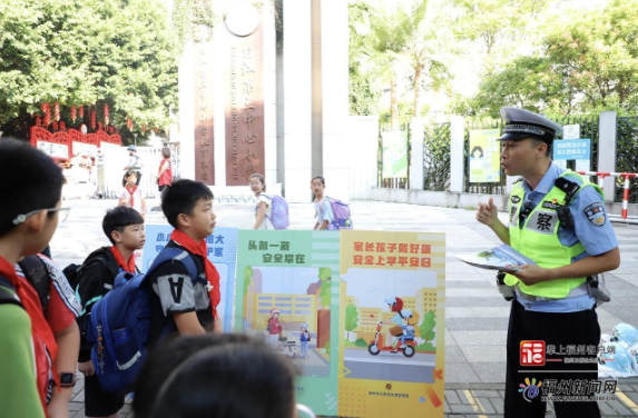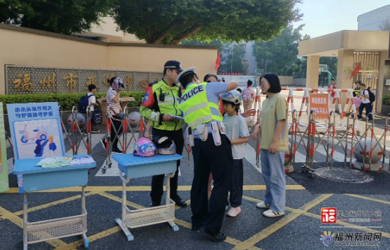 执勤交警为学生戴上安全头盔。福州交警供图 在上放学高峰路段,福州交警精心设计了图文并茂的安全展板,吸引了众多家长和学生驻足观看。交警还走进校园开设“头盔安全小课堂”,通过趣味问答、模型演示等互动方式,让孩子们在轻松氛围中牢记“骑行要戴头盔”的安全常识。