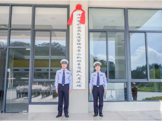 △漳州市公安局交通管理支队党委副书记、政委蒋惠典和漳州市公安局交通管理支队副支队长黄顺清共同为常山机动车驾驶人考试场揭牌。
