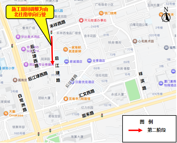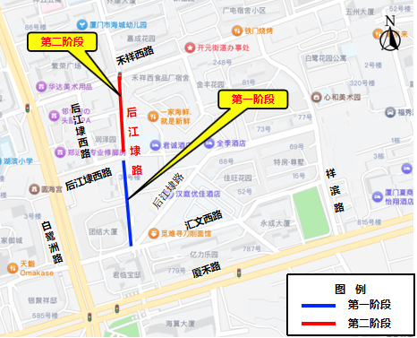 社会车辆绕行路径 主要通过汇文西路、白鹭洲路、后江埭西路及禾祥西路等周边道路通行。 第二阶段