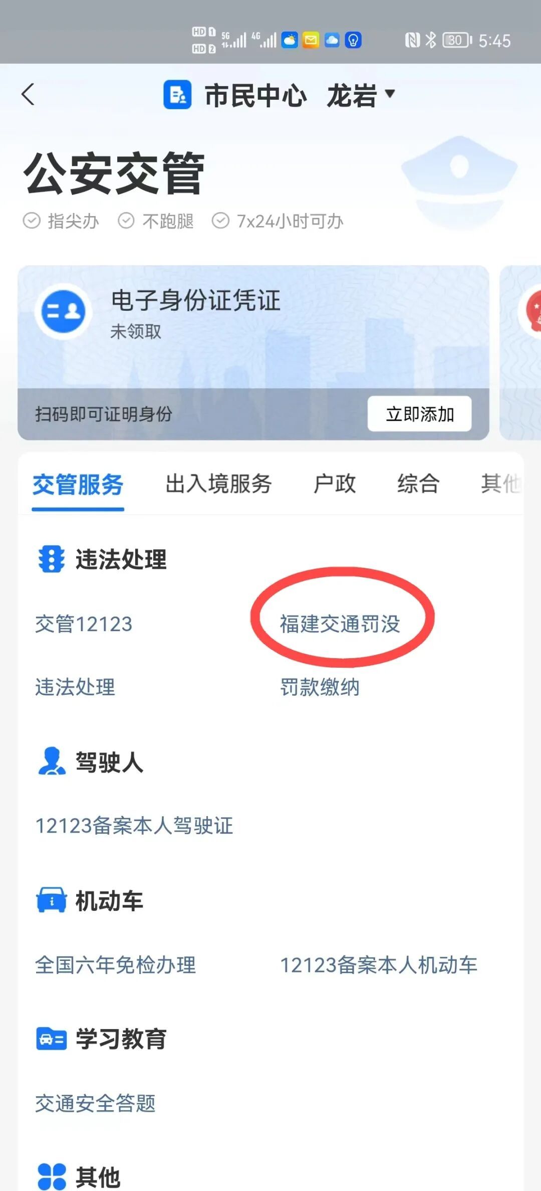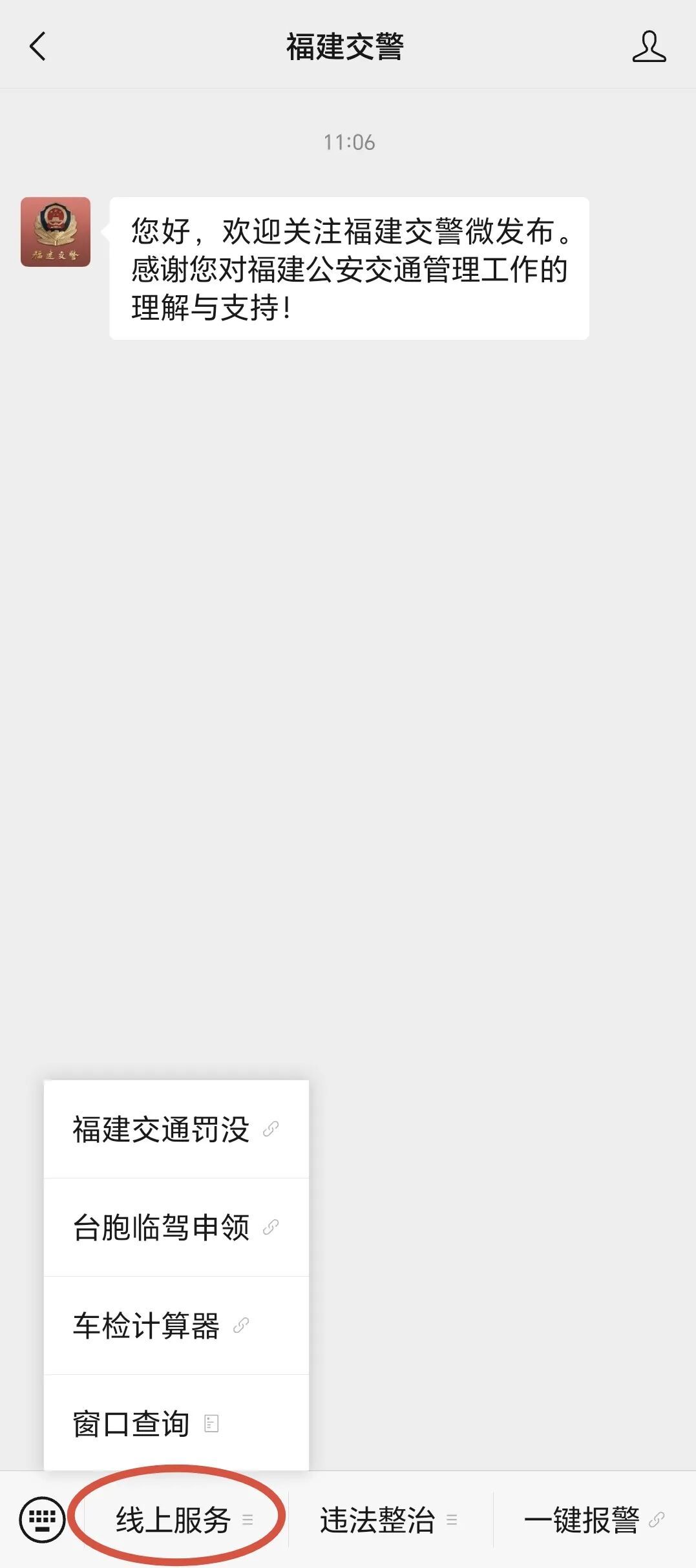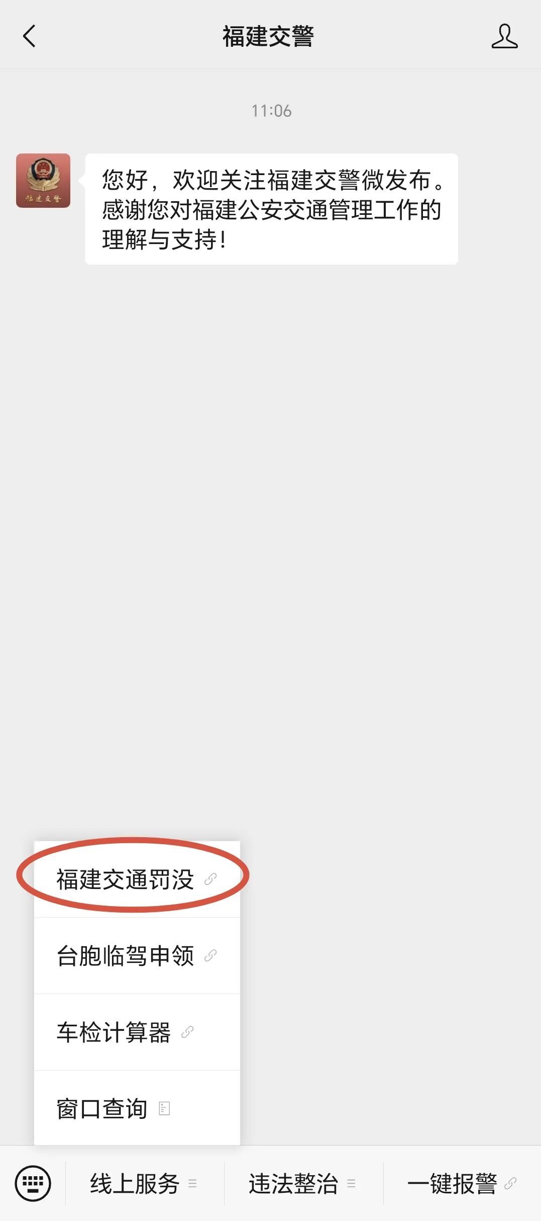 2、打开微信关注“福建交警”公众号,点击“违法处理”,进入“福建交通罚没”。