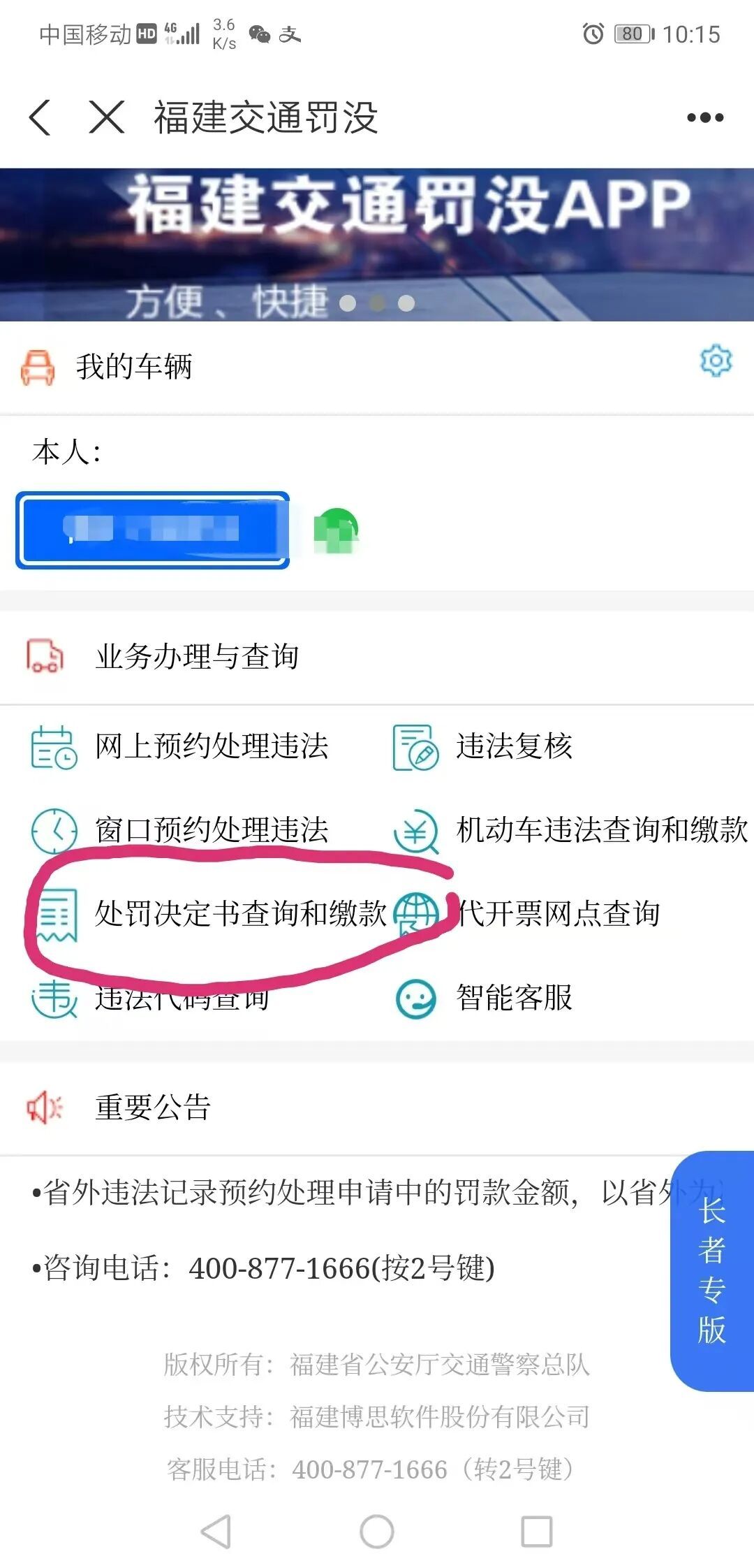 上述两种途径处理,如符合条件、免予记分!(违法行为照片未记录到机动车驾驶人面部清晰图像的,可不记分处理)。预约成功后,审核时限半个工作日完成。审核通过的,即可直接通过手机缴款。 注意事项: 1、交通违法行为所涉及的机动车系在福建省公安机关交通管理部门注册登记的; 2、交通违法行为系交通技术监控设备查获的、交通违法地在全国范围内,且当事人对交通违法事实和拟被处以的行政处罚及其依据没有异议的; 3、申请处理的交通违法行为属于依法可以适用简易程序处理的交通违法行为,即被处以警告或者罚款200元以下的交通违法行为; 4、同一个交通违法行为只能申请在网上处理一次。 5、预约处理审核通过后,应于十五日内完成缴款;超过十五日未缴纳罚款的,每日按罚款数额的百分之三加处罚款,但加处罚款不超过交通违法行为的罚款数额; 6、如需纸质罚款票据的(仅能打印一次),可持网上缴费成功时形成的电子票据信息到指定的银行代开网点打印《福建省政府非税收入票据(银行代开专用)》 缴款方式 “福建交通罚没”找到“处罚决定书查询和缴款”,然后输入决定书号即可缴款。