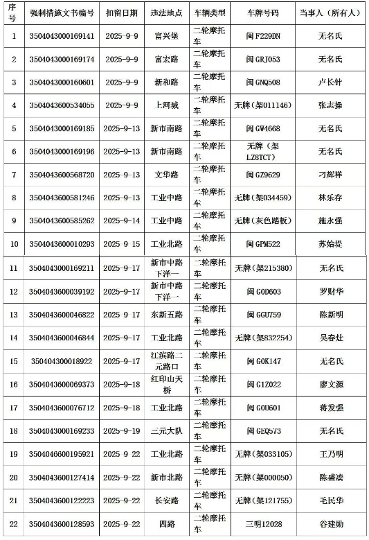 根据《中华人民共和国道路交通安全法》第一百一十二条第三款和《中华人民共和国道路交通安全法实施条例》第一百零七条之规定,现对2025年9月9日至2025年9月22日期间因违反道路交通安全法律法规被依法扣留的逾期未接受处理的二十二辆车辆予以公告。请机动车驾驶人或者车辆所有人、管理人前来接受处理,经公告三个月仍不来接受处理的,我队将依法处置上述车辆。