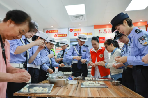 同时,现场组织老年人填写交通安全入户调研问卷,精准收集老年群体对交通服务的需求与建议,为后续优化老年人出行环境提供数据支撑。 活动尾声,富春社区“孝老食堂”热闹开餐,队员与社区志愿者、老年朋友们围坐一堂,共同包饺子、话家常。大家分工协作,擀皮、包馅、煮饺子,现场洋溢着温馨和谐的邻里氛围。