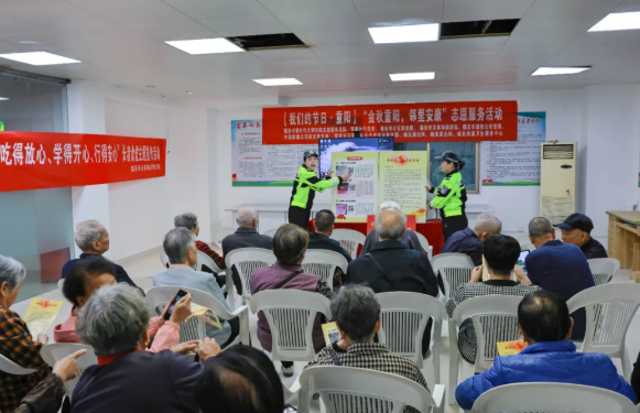为传承中华民族敬老爱老传统美德,切实提升老年群体交通安全意识与自我保护意识,10月23日,交管大队女子护学岗中队联合富春社区、城南派出所、城北卫生服务中心等多家单位,在上海公馆党群服务中心共同开展“金秋重阳,邻里安康”志愿服务活动,以实际行动为辖区老年人送上关怀与温暖。