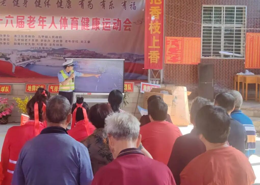 洛江 洛江大队组织警力深入马甲镇第十六届老年人体育健康运动会现场开展老年人交通安全宣传活动,将安全知识与贴心服务送到老年群体身边,为长辈们的出行安全保驾护航。 活动现场,民警结合老年人出行习惯和认知特点,创新宣传形式。通过播放警示视频、专人现场讲解典型事故案例,让老年人直观感受交通违法的危害;同时设置问答互动环节,针对老年人关心的出行问题逐一解答,有效调动大家的参与积极性,扎实普及交通安全知识。 为强化防护效果,民警还为参与活动的老年人赠送安全帽,并用通俗易懂的语言讲解佩戴安全帽的重要性,手把手指导大家掌握正确佩戴方法,确保每一位长辈都能规范使用。现场老年人纷纷表示,这样的宣传接地气、有实效,既学到了知识又领到了实用的安全装备。