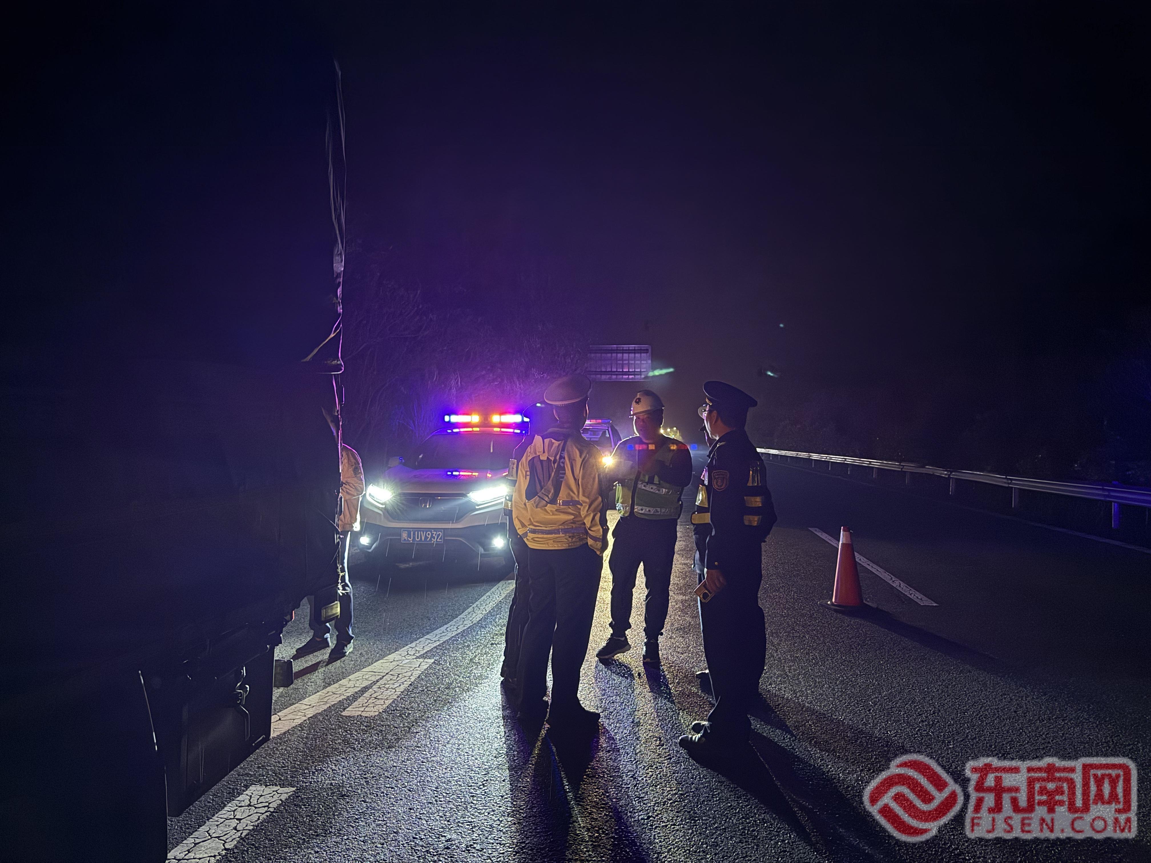 多部门现场商议对策。宁德高速执法支队供图 宁德高速执法支队周宁中队迅速赶赴现场处置,第一时间在来车方向设警示标志、鸣警报示,随后与交警、路勤分工协作,引导肇事车至紧急停车带,手持照明设备清理关键区域,快速开辟出快车道供车辆通行,同时专人在隧道入口定点引导车流,避免交通拥堵加剧。