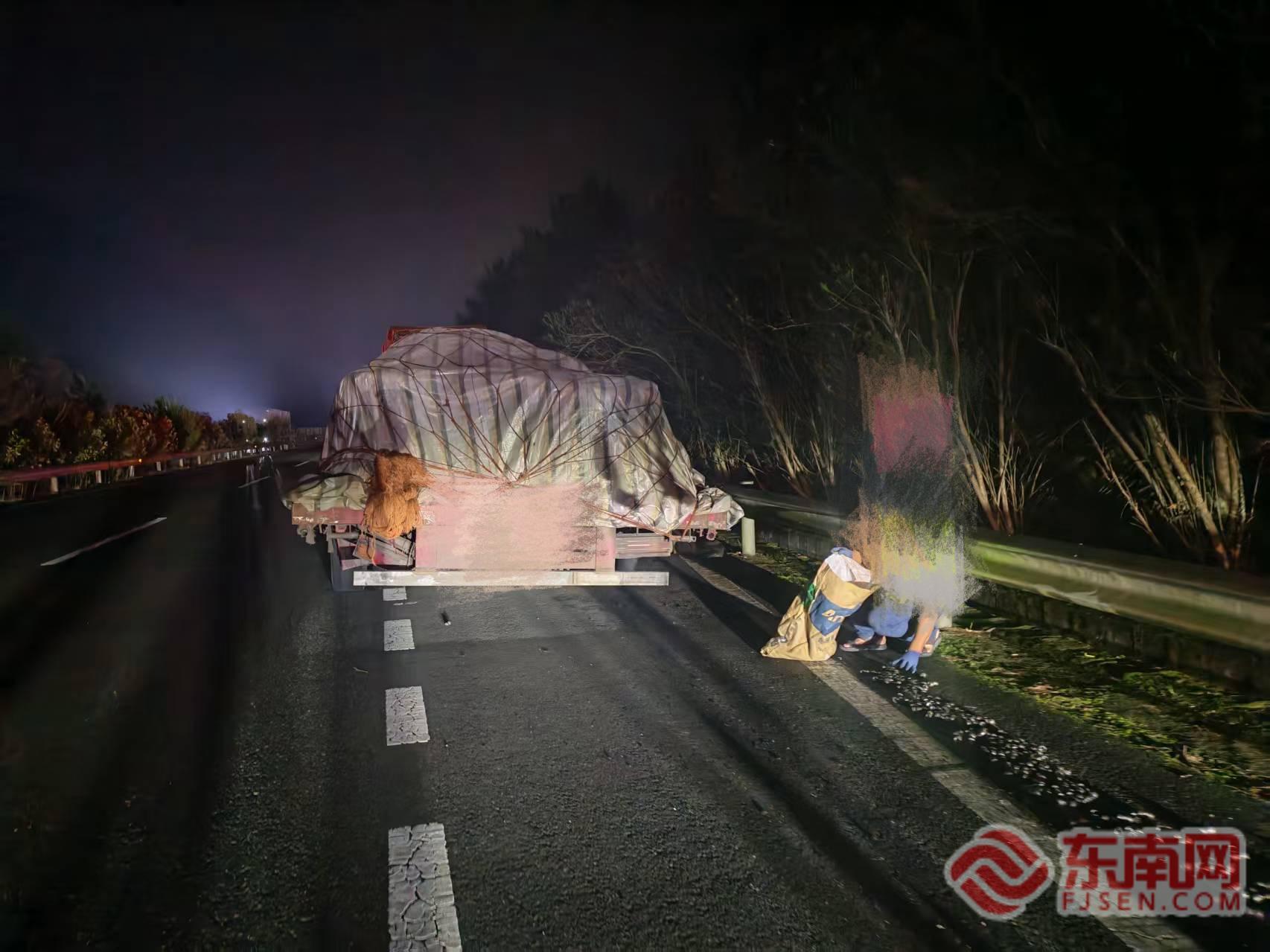 撒落现场。宁德高速执法支队供图 待交通初步恢复通行后,针对十余辆爆胎滞留车辆,执法队员与交警组成护送队,将还能够行驶的车辆分批引导至附近服务区,并主动协助车辆对接保险公司与就近维修厂,协助完成定损、换胎事宜。截至当晚19时许,受损车辆基本完成轮胎更换,经安全检查后逐辆驶离服务区,继续后续行程。 此次应急处置全程高效有序,未发生二次事故,宁德高速执法、交警、路勤多部门的快速联动、精准协作,不仅及时化解了雨夜险情,更以“执法为民”的实际行动,最大限度减少了群众出行损失,有力保障了高速公路通行安全与群众出行顺畅。 宁德高速执法部门提醒:货车驾驶员出车前,务必仔细检查货物捆绑加固情况,确保装载牢固;若在高速上遇货物掉落或突发险情,切勿盲目停车捡拾,需牢记“车靠边、快警示、人撤离、即报警”原则,及时拨打12122求助,共同守护高速通行安全。 |