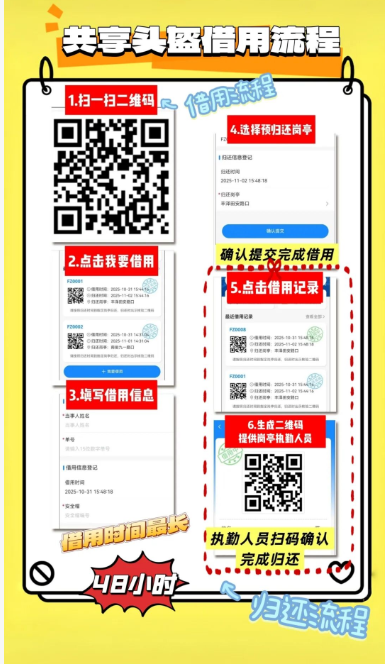 目前第一批10个头盔借用点已正式启用,覆盖鲤城、丰泽、洛江三大城区关键路口,具体点位如下: 丰泽区 刺桐路东湖街路口、刺桐路泉秀街路口、丰泽街田安路路口、府东路海星街路口 鲤城区 钟楼岗、南俊路东街路口、南俊路九一街路口、九一街温陵路路口、泉秀街温陵路路口 洛江区 万安交警中队门口 市民可免费扫码借用,借用期限为48小时,超期未还将影响后续借用权限。后续我们还将根据市民需求,逐步优化借用点布局,让“小头盔”守护“大安全”更贴心!