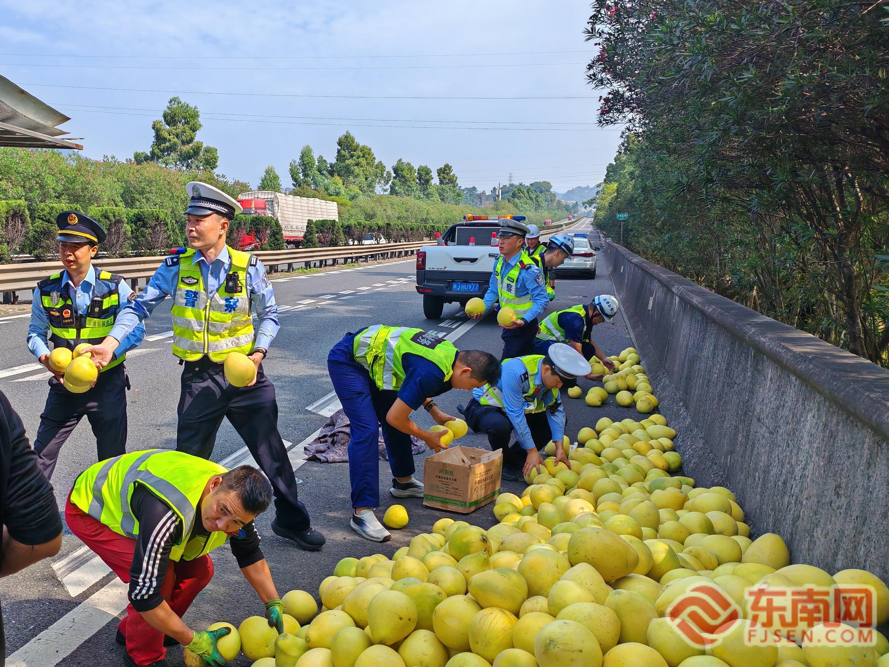 合力处置洒落柚子。宁德高速执法支队供图 情况紧急,刻不容缓。执法人员立即启动应急预案,同步激活“5+N”协作机制。现场各方力量分工明确、协同高效:一组人员迅速负责现场安全布控,在事故后方规范设置警示区域,摆放反光锥筒,并指挥引导后方车辆有序通行;另一组人员则与闻讯赶来的高速交警、路勤、养护等联动单位并肩协作,以应急车道为主作业面,全力投入散落柚子的清理与转运工作。整个处置流程衔接紧密,各方配合默契,形成了高效的处置合力。