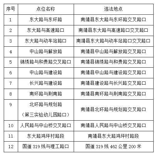 关于南靖县辖区内新增交通违法采集设备的公告 为进一步规范道路交通秩序,营造良好的道路交通环境,确保我县道路交通安全、有序、畅通,南靖县公安局交通管理大队现将辖区内新增交通违法采集设备公告如下,并将根据《中华人民共和国道路交通安全法》有关规定对驾驶机动车违反道路交通信号灯通行的、逆向行驶、不按导向车道行驶、违反禁止标线指示、驾驶人未按规定使用安全带的、驾车接拨手持电话等违法行为进行抓拍处罚,望广大驾驶员相互转告,自觉遵守交通法律法规,安全文明出行,共同维护道路交通秩序。 设备点位