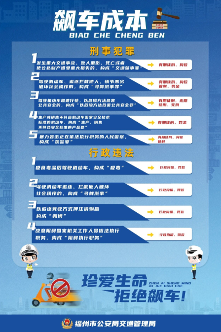 马路不是竞技场 非法改装、飙车炫技 ≠ 酷炫 而是安全与法律的双重风险 相关法律法规 《福建省非机动车管理办法》 第三十条 禁止拼装、加装、改装非机动车或者驾驶拼装、加装、改装的非机动车上道路行驶。 有下列行为之一的,属于拼装、加装、改装非机动车: (一)加装动力装置; (二)擅自改装或者改动电动自行车的最高时速、功率、电压等功能; (三)加装车篷等妨碍安全驾驶的装置; (四)更改电动自行车认证数据; (五)其他影响非机动车通行安全的拼装、加装、改装行为。 第四十三条 违反本办法规定,驾驶有动力装置驱动但设计最高时速、空车质量、外形尺寸不符合国家有关安全技术标准的电动自行车、残疾人机动轮椅车上道路行驶的,由县级人民政府公安机关交通管理部门对车辆驾驶人处200元罚款。 前款车辆经依法成立的检验检测机构鉴定,属于机动车的,由县级人民政府公安机关交通管理部门按照机动车管理规定依法予以处置。 第四十七条 违反本办法规定,以营利为目的拼装、加装、改装非机动车或者销售拼装、加装、改装的非机动车的,由县级以上人民政府市场监督管理部门处2000元以上1万元以下罚款;有违法所得的,依法予以没收。 违反本办法规定,驾驶拼装、加装、改装的非机动车上道路行驶的,由县级人民政府公安机关交通管理部门责令恢复原状,对非机动车驾驶人处200元罚款。 竞速飙车、轰鸣“炸街” 扰人清静 易造成交通事故 威胁道路交通安全 情节严重还将面临法律的严惩